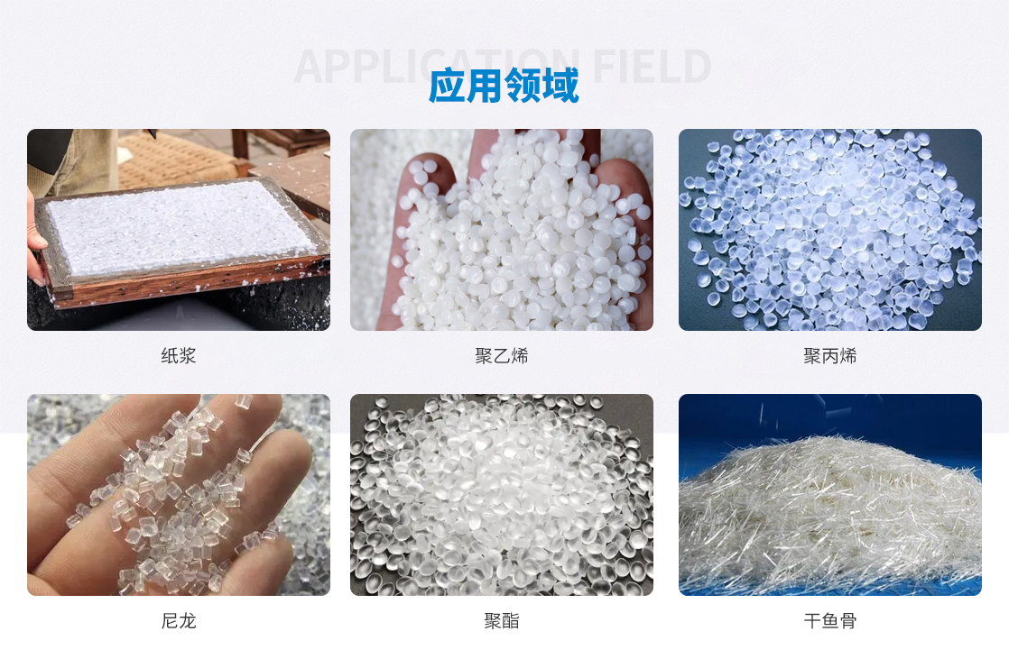应用领域:磨木浆(RGP)、CGP(化学细磨浆)、半化学浆(SCP)、高得率亚硫酸盐浆(SP)、硫酸盐浆 (KP)、麦草浆、蔗渣浆(bagasse pulp)、废纸、聚乙烯,聚丙烯、尼龙、聚酯、腈纶、玻璃纤维、碳纤 维、纤维板、硬纸板浆谷类、干鱼骨