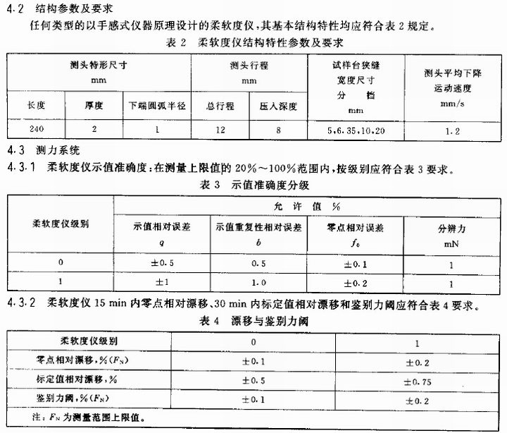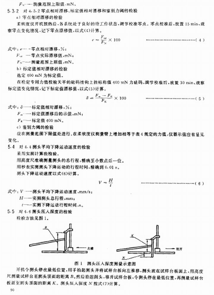 4.4 柔软度仪测头平均下降运动速度1.2 m m/s,误差应不超过f0.2m m/s,