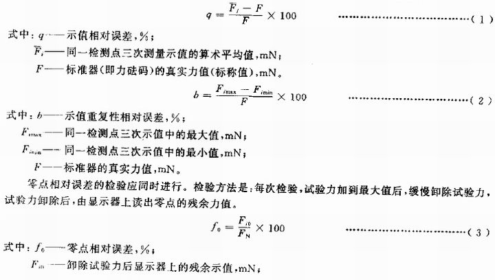 检验前将仪器调好零点·在测量范围内选择100,200,400,600,800和1000 mN 六个检测点然后按进程顺Fi;分别将力珐码挂在线钩上,每点重复检侧三次,以力硅码标称值为依据,在显示器上读数,示值相对误差、示值重复性相对误差及零点相对误差分别按式(1)、式(2)和式(3)进行计算。