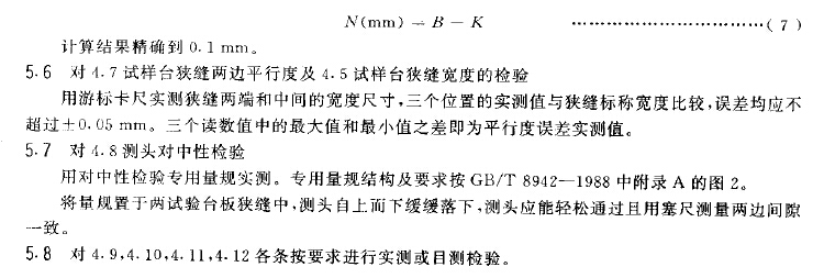 4.7 柔软度仪试样台狭缝两边应平行,平行度误差应不超过。.05m m。两试样台组成狭缝的两垂直平面的上部直边刃口,应用装成450的油石将棱角倒钝。狭缝倒棱程度与合格判定见附录A(提示的附录)。